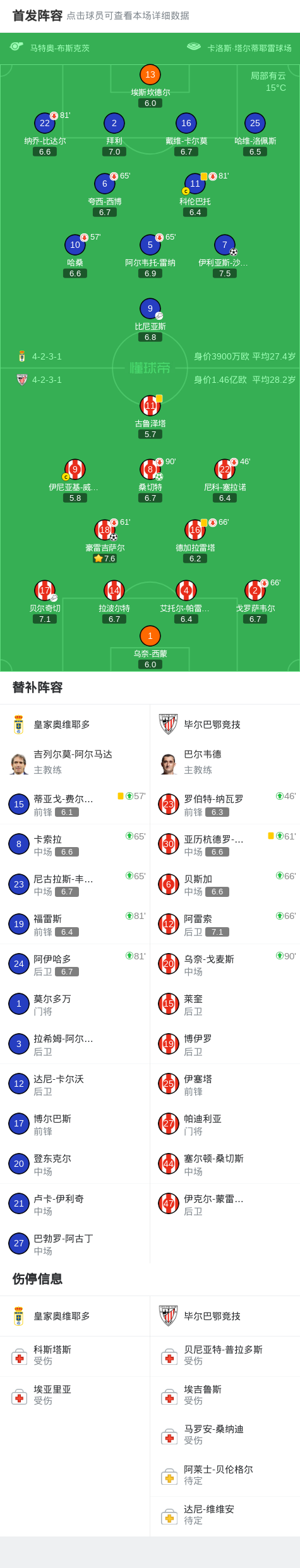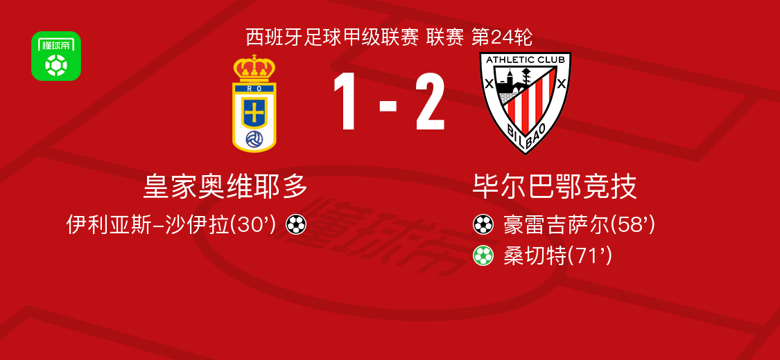 北京时间2月15日西班牙足球甲级联赛 联赛 第24轮,皇家奥维耶多主场对阵毕尔巴鄂竞技。皇家奥维耶多伊利亚斯-沙伊拉破门。毕尔巴鄂竞技豪雷吉萨尔破门,桑切特破门。最终比分皇家奥维耶多 1-2 毕尔巴鄂竞技。